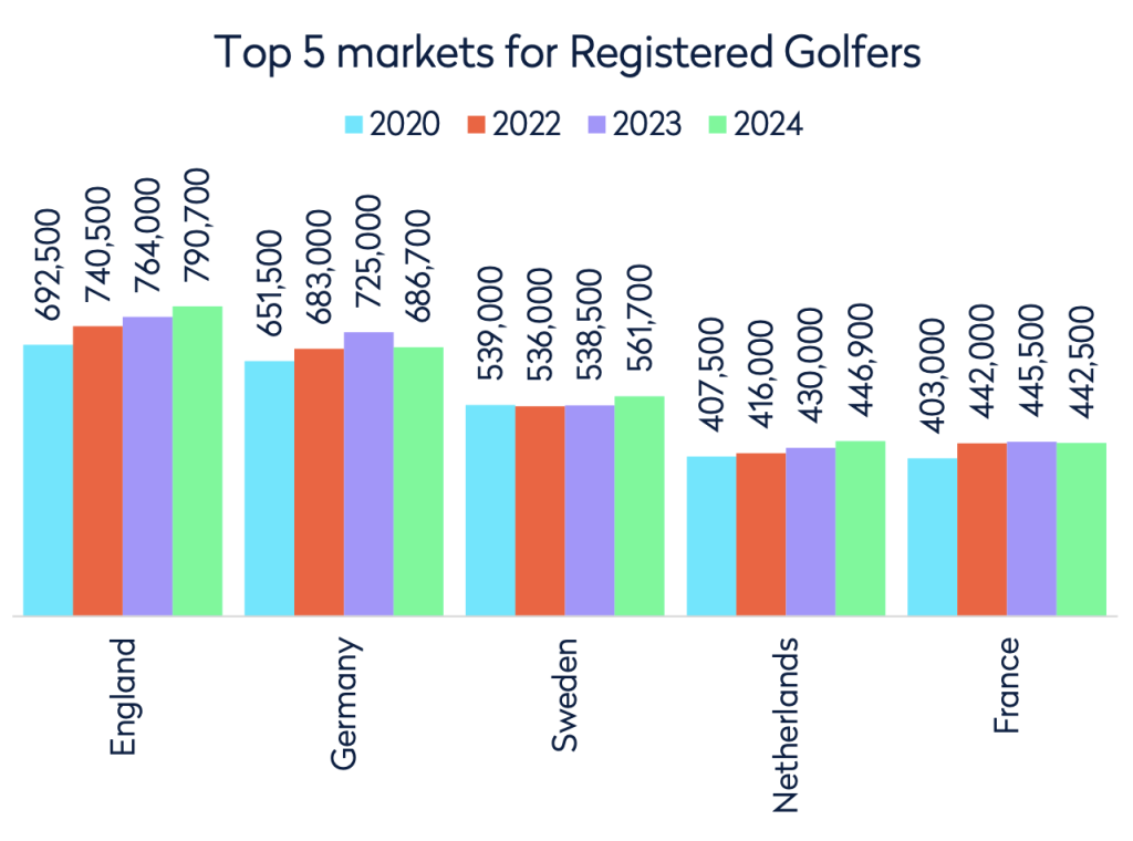 The number of registered golfers – those members of a golf club within their national association or affiliated through direct subscription (e.g., iGolf) – has increased from 8.2 to 8.4 million. This demonstrates a sustained growth from 7.4 million in 2020.